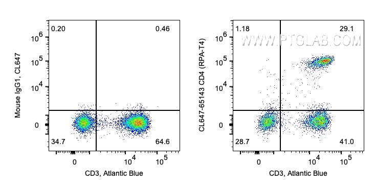 The CD4 antibody from Proteintech is a mouse monoclonal antibody to a n/a of human CD4. This antibody recognizes human antigen. The CD4 antibody has been validated for the following applications: FC analysis. This antibody is coraliteR plus 647.