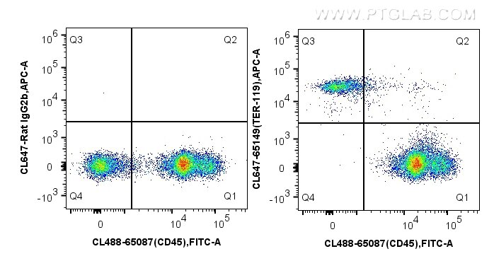 The TER-119 antibody from Proteintech is a rat monoclonal antibody to a day-14 fetal liver cells from a c57bl/6 mouse of mouse TER-119. This antibody recognizes mouse antigen. The TER-119 antibody has been validated for the following applications: FC analysis. This antibody is coraliteR plus 647.