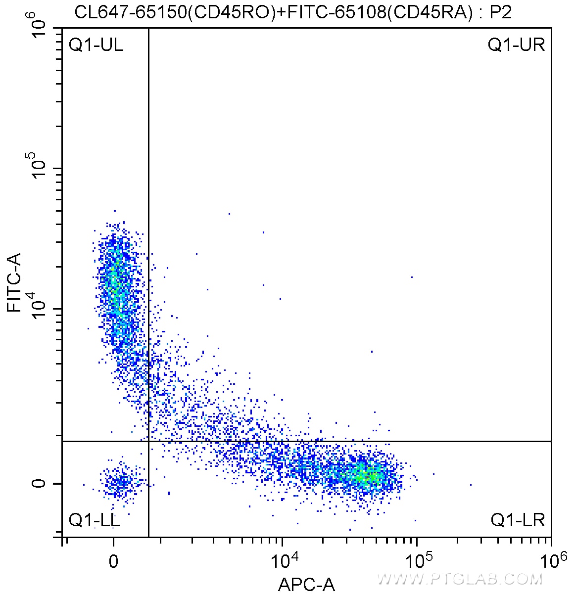 The CD45RO antibody from Proteintech is a mouse monoclonal antibody to a il-2 dependent t cell line, ca1 of human CD45RO. This antibody recognizes human antigen. The CD45RO antibody has been validated for the following applications: FC analysis. This antibody is coraliteR plus 647.