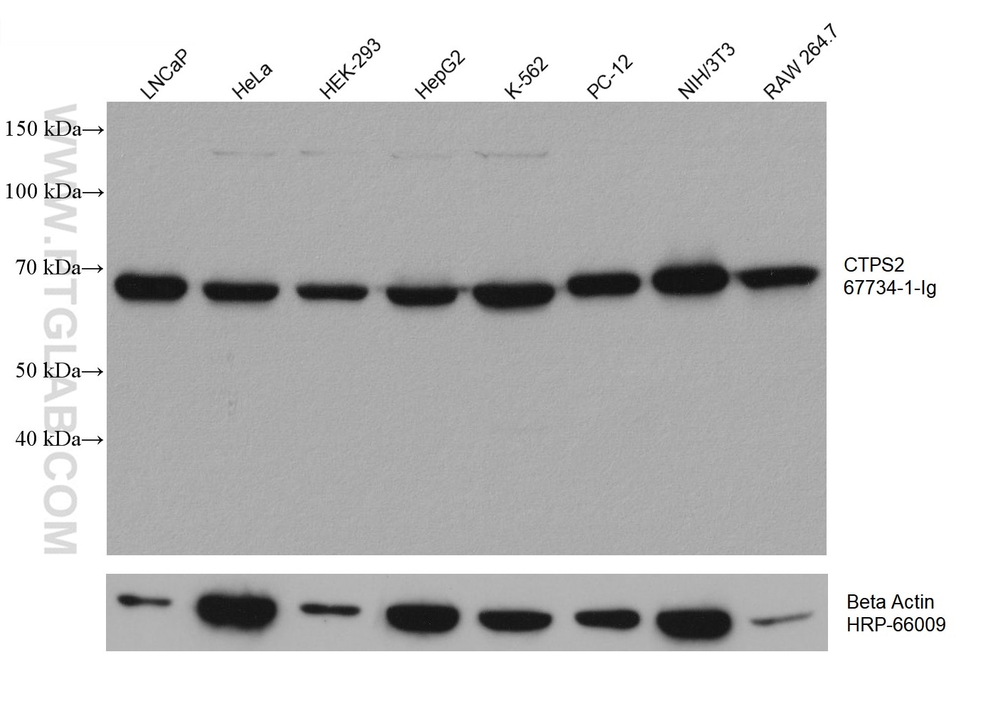 The CTPS2 antibody from Proteintech is a mouse monoclonal antibody to a recombinant protein of human CTPS2. This antibody recognizes human, mouse, rat antigen. The CTPS2 antibody has been validated for the following applications: WB, IHC, IF/ICC, IF-P, ELISA analysis.