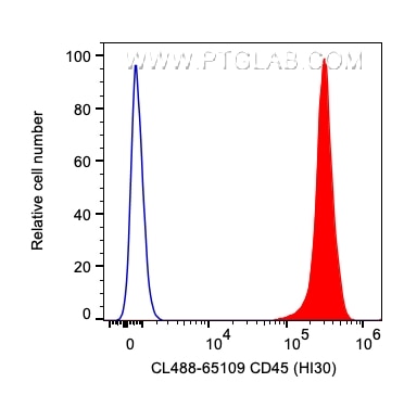 The CD45 antibody from Proteintech is a mouse monoclonal antibody to a human peripheral blood leucocytes of human CD45. This antibody recognizes human antigen. The CD45 antibody has been validated for the following applications: IF/ICC, FC analysis. This antibody is coraliteR plus 488.