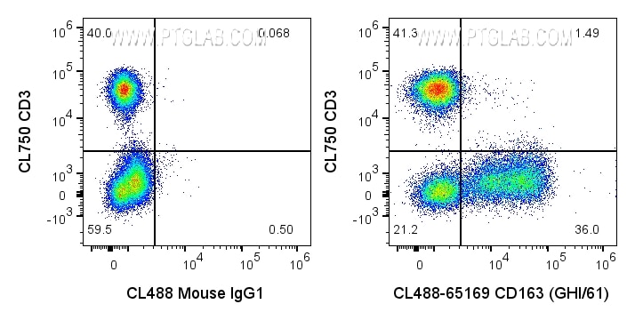 The CD163 antibody from Proteintech is a mouse monoclonal antibody to a glycoprotein preparation from hairy cell leukemia spleen of human CD163. This antibody recognizes human antigen. The CD163 antibody has been validated for the following applications: FC analysis. This antibody is coraliteR plus 488.