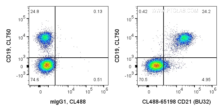 The CD21 antibody from Proteintech is a mouse monoclonal antibody to a n/a of human CD21. This antibody recognizes human antigen. The CD21 antibody has been validated for the following applications: FC analysis. This antibody is coraliteR plus 488.