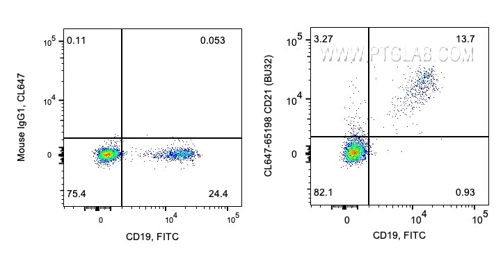 The CD21 antibody from Proteintech is a mouse monoclonal antibody to a n/a of human CD21. This antibody recognizes human antigen. The CD21 antibody has been validated for the following applications: FC analysis. This antibody is coraliteR plus 647.
