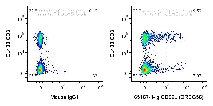 The CD62L antibody from Proteintech is a mouse monoclonal antibody to a pma-activated human peripheral blood leukocytes of human CD62L. This antibody recognizes human antigen. The CD62L antibody has been validated for the following applications: FC analysis.