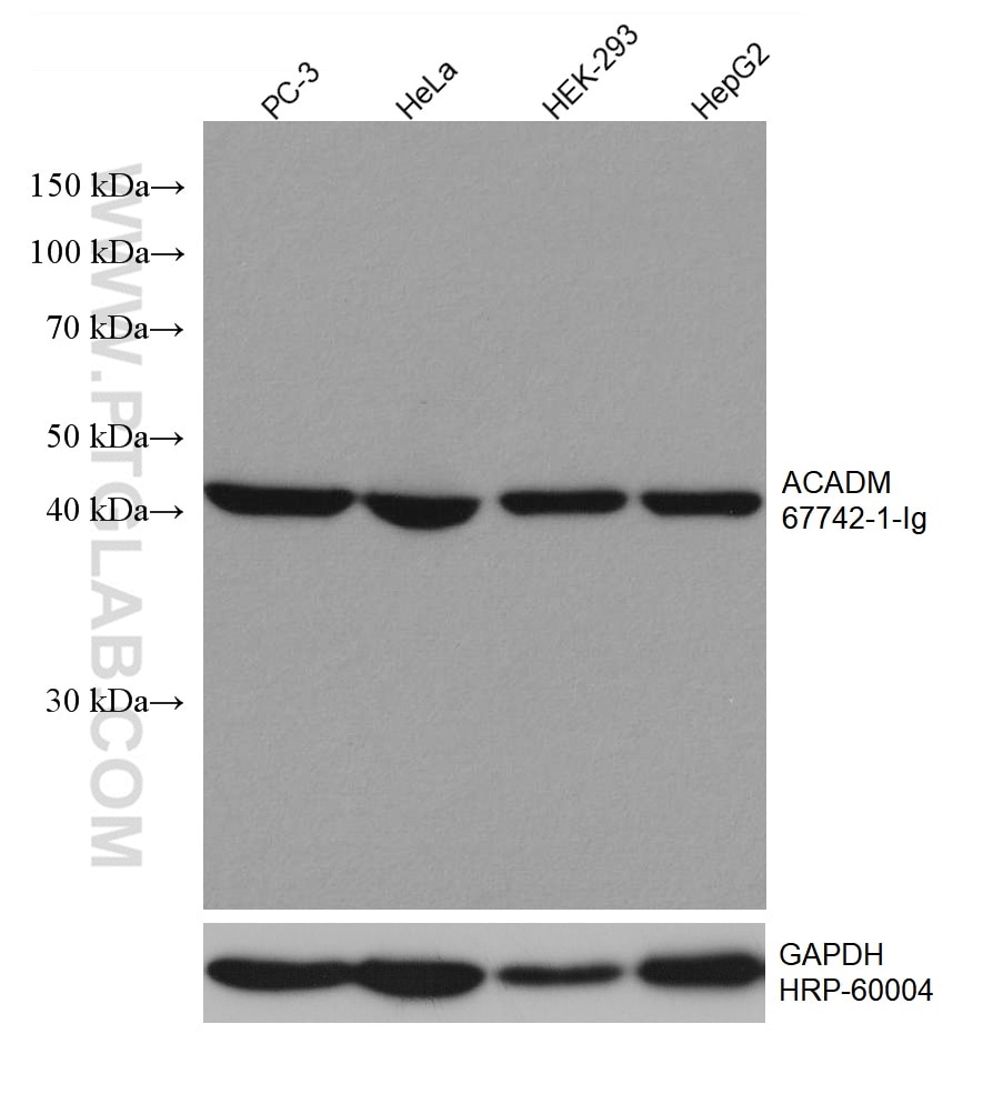 The ACADM antibody from Proteintech is a mouse monoclonal antibody to a recombinant protein of human ACADM. This antibody recognizes human, rat, pig antigen. The ACADM antibody has been validated for the following applications: WB, IHC, IF-P, ELISA analysis.