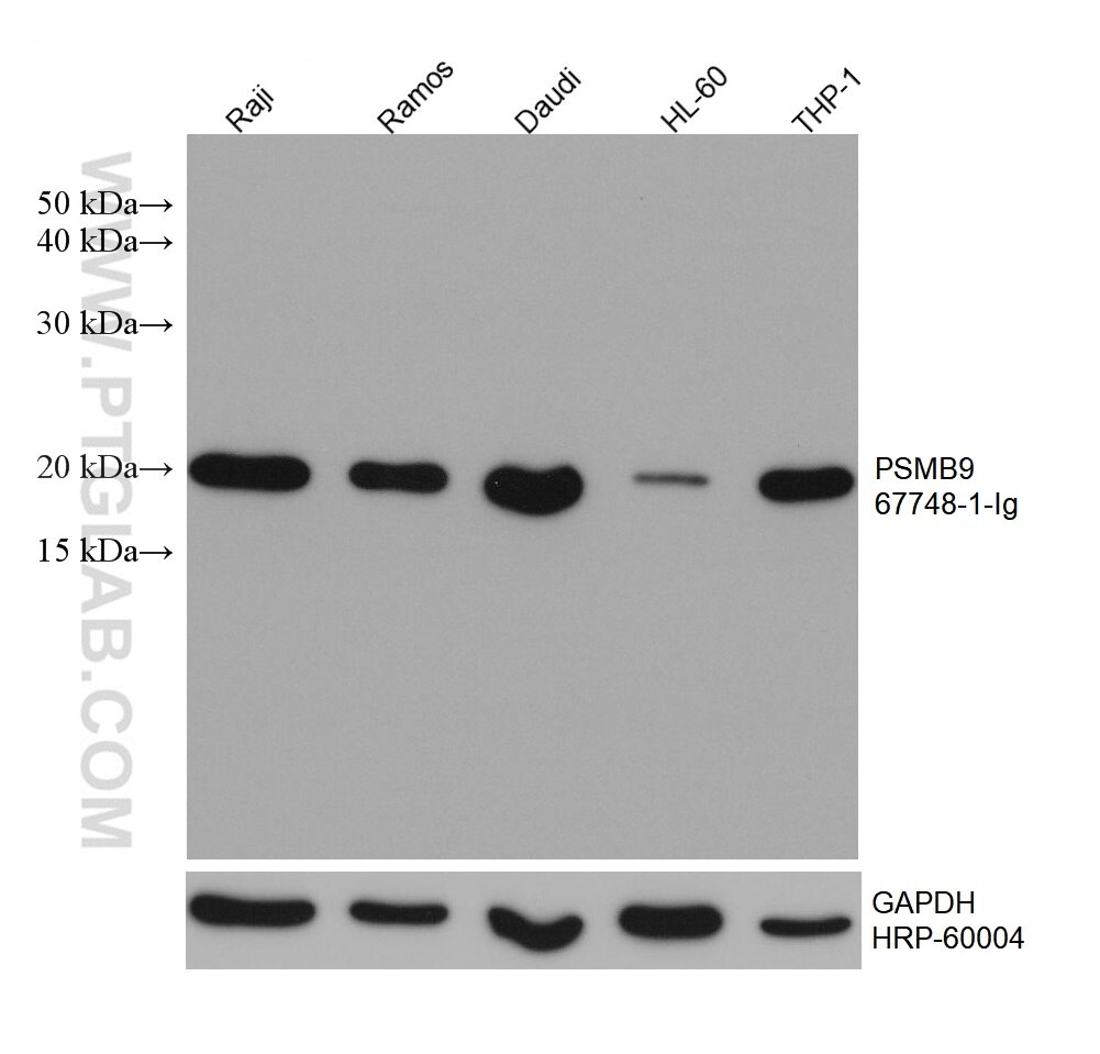 The PSMB9 antibody from Proteintech is a mouse monoclonal antibody to a recombinant protein of human PSMB9. This antibody recognizes human, rat antigen. The PSMB9 antibody has been validated for the following applications: WB, IHC, ELISA analysis.