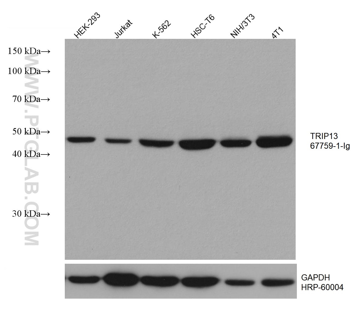 The TRIP13 antibody from Proteintech is a mouse monoclonal antibody to a recombinant protein of human TRIP13. This antibody recognizes human, mouse, rat antigen. The TRIP13 antibody has been validated for the following applications: WB, ELISA analysis.