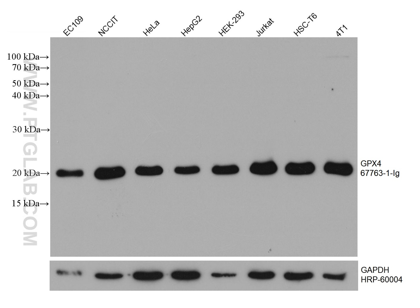 The GPX4 antibody from Proteintech is a mouse monoclonal antibody to a recombinant protein of human GPX4. This antibody recognizes human, mouse, rat, pig, rabbit, chicken, zebrafish, hamster, dog antigen. The GPX4 antibody has been validated for the following applications: WB, IHC, IF/ICC, IF-P, ELISA analysis.