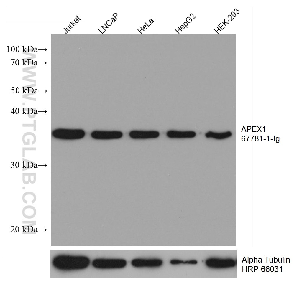 The APEX1 antibody from Proteintech is a mouse monoclonal antibody to a recombinant protein of human APEX1. This antibody recognizes human, mouse, rat, pig, rabbit antigen. The APEX1 antibody has been validated for the following applications: WB, IHC, ELISA analysis.