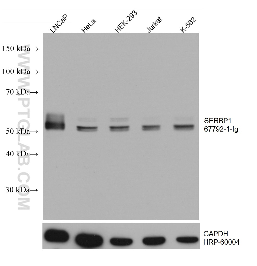 The SERBP1 antibody from Proteintech is a mouse monoclonal antibody to a recombinant protein of human SERBP1. This antibody recognizes human, mouse, rat, pig, canine antigen. The SERBP1 antibody has been validated for the following applications: WB, IHC, IF-P, IP, ELISA analysis.