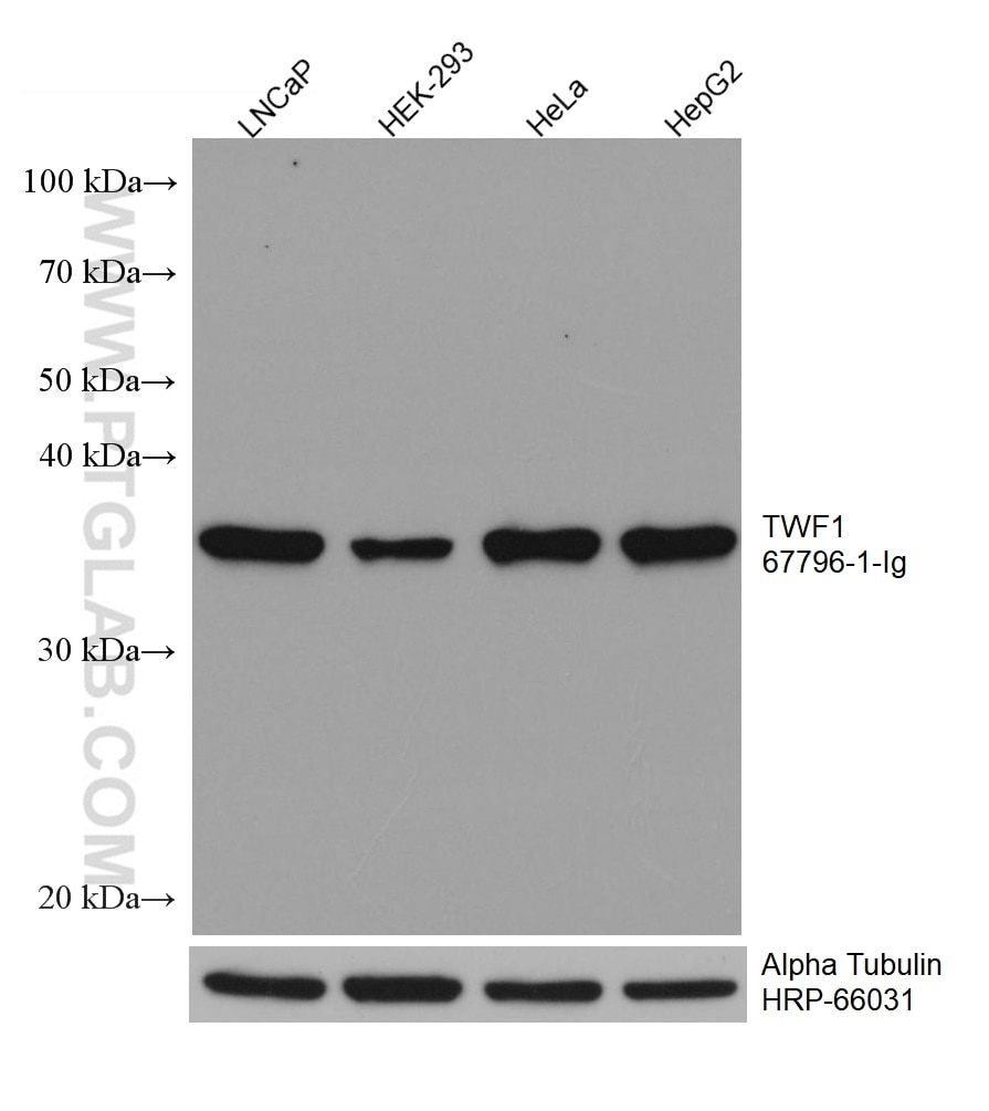 The TWF1 antibody from Proteintech is a mouse monoclonal antibody to a recombinant protein of human TWF1. This antibody recognizes human antigen. The TWF1 antibody has been validated for the following applications: WB, IF/ICC, ELISA analysis.