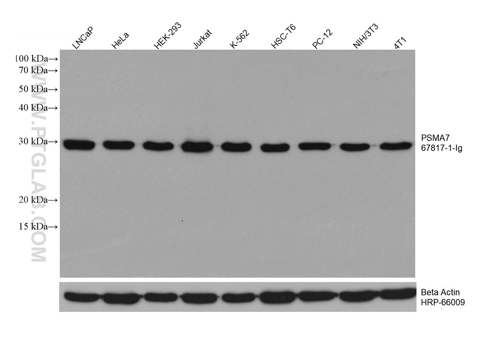 The PSMA7 antibody from Proteintech is a mouse monoclonal antibody to a recombinant protein of human PSMA7. This antibody recognizes human, mouse, rat antigen. The PSMA7 antibody has been validated for the following applications: WB, IHC, IF/ICC, FC (Intra), ELISA analysis.