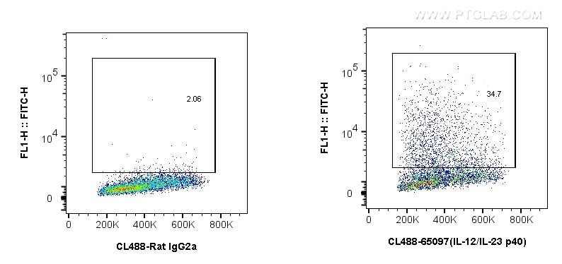 The IL-12/IL-23 p40 antibody from Proteintech is a rat monoclonal antibody to a cho expressed, recombinant mouse il-12 p70 of mouse IL-12/IL-23 p40. This antibody recognizes mouse antigen. The IL-12/IL-23 p40 antibody has been validated for the following applications: FC (Intra) analysis. This antibody is coraliteR plus 488.