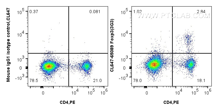 The Foxp3 antibody from Proteintech is a mouse monoclonal antibody to a n/a of mouse Foxp3. This antibody recognizes mouse antigen. The Foxp3 antibody has been validated for the following applications: FC (Intra) analysis. This antibody is coraliteR plus 647.