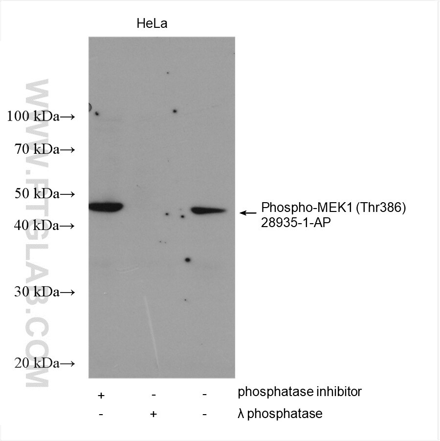 The Phospho-MEK1 (Thr386) antibody from Proteintech is a rabbit polyclonal antibody to a peptide of human Phospho-MEK1 (Thr386). This antibody recognizes human antigen. The Phospho-MEK1 (Thr386) antibody has been validated for the following applications: WB, IF/ICC, ELISA analysis.