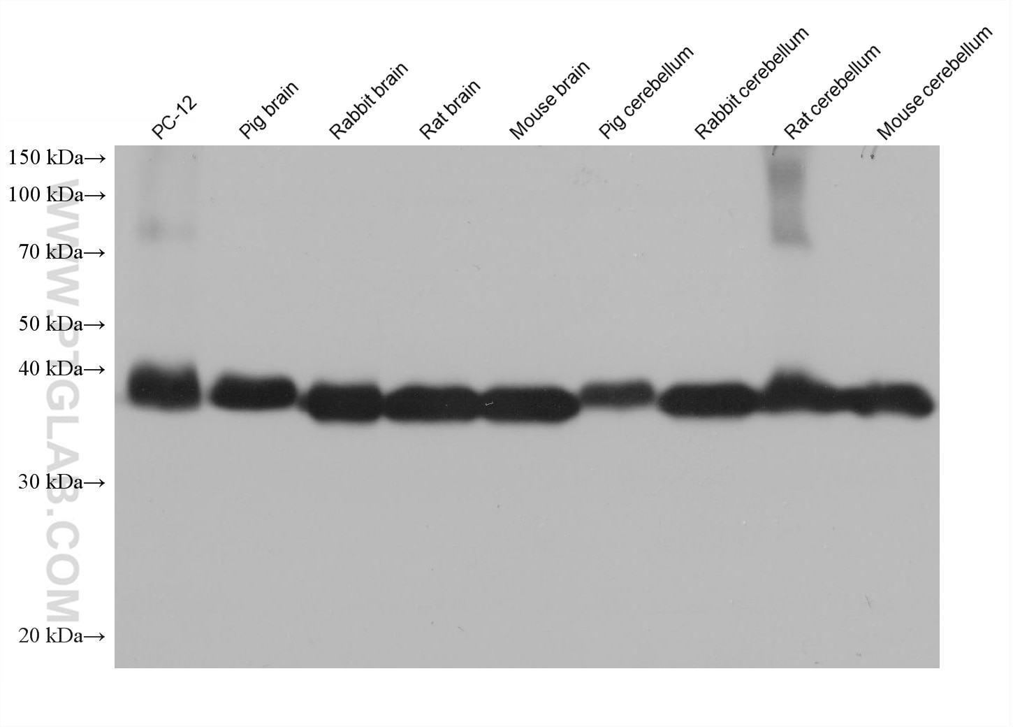 The Synaptophysin antibody from Proteintech is a mouse monoclonal antibody to a recombinant protein of human Synaptophysin. This antibody recognizes human, mouse, rat, pig, rabbit antigen. The Synaptophysin antibody has been validated for the following applications: WB, IHC, IF/ICC, IF-P, ELISA analysis.