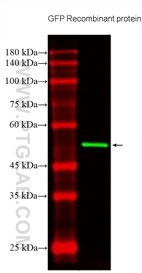 The GFP tag antibody from Proteintech is a mouse monoclonal antibody to a recombinant protein. This antibody recognizes recombinant protein antigen. The GFP tag antibody has been validated for the following applications: WB, IF/ICC analysis. This antibody is coraliteR plus 488.