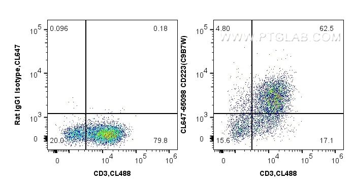 The LAG-3/CD223 antibody from Proteintech is a rat monoclonal antibody to a murine cd223-ig fusion protein of mouse LAG-3/CD223. This antibody recognizes mouse antigen. The LAG-3/CD223 antibody has been validated for the following applications: FC analysis. This antibody is coraliteR plus 647.