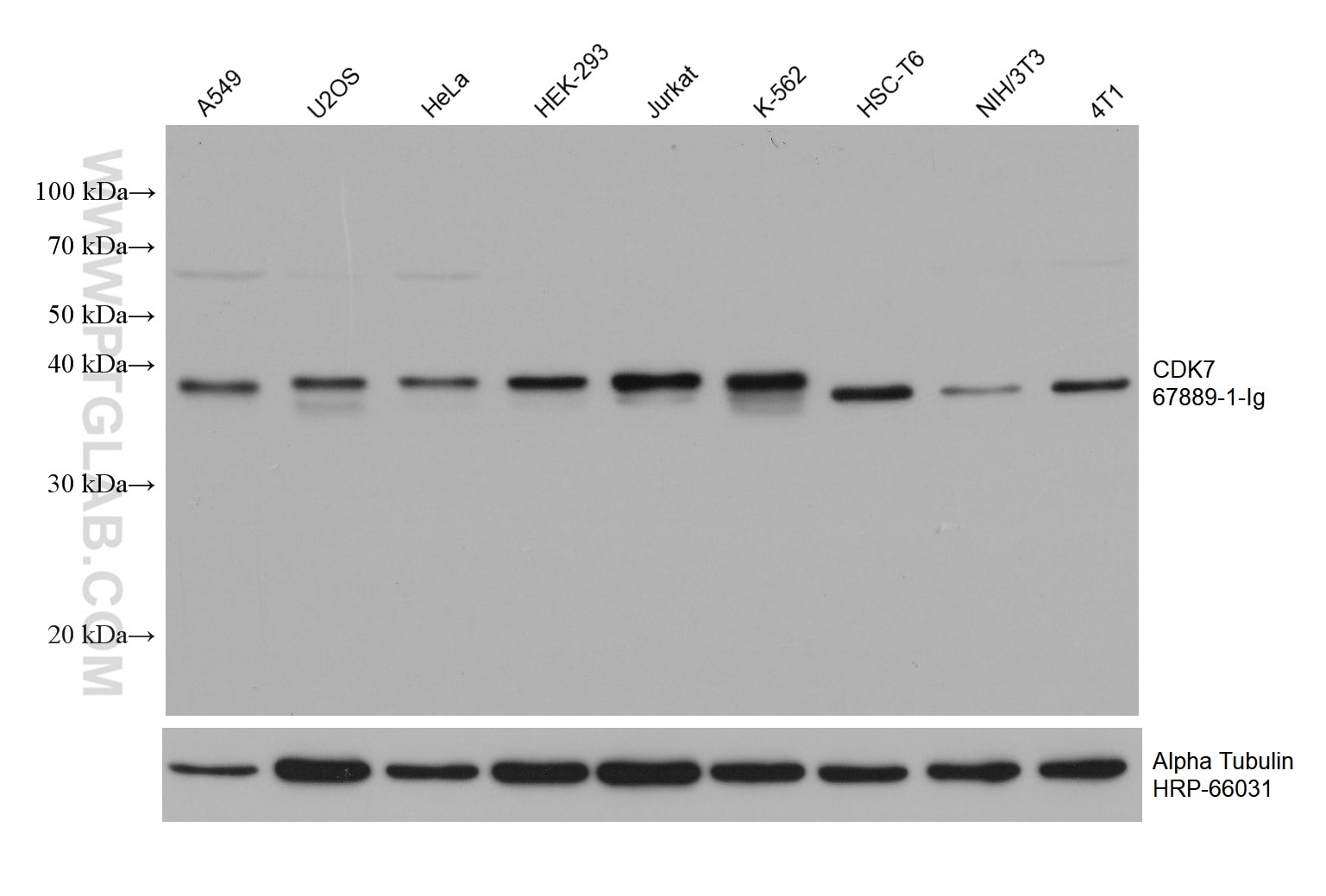 The CDK7 antibody from Proteintech is a mouse monoclonal antibody to a recombinant protein of human CDK7. This antibody recognizes human, mouse, rat antigen. The CDK7 antibody has been validated for the following applications: WB, IHC, IF/ICC, ELISA analysis.