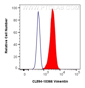 The Vimentin antibody from Proteintech is a rabbit polyclonal antibody to a recombinant protein of human Vimentin. This antibody recognizes human, mouse, rat antigen. The Vimentin antibody has been validated for the following applications: IF/ICC, FC (Intra) analysis. This antibody is coraliteR594.