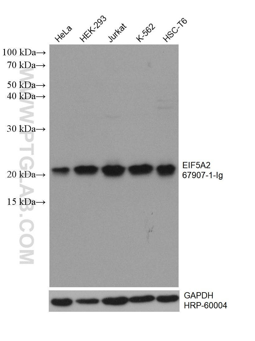 The EIF5A2 antibody from Proteintech is a mouse monoclonal antibody to a recombinant protein of human EIF5A2. This antibody recognizes human, rat antigen. The EIF5A2 antibody has been validated for the following applications: WB, IHC, IF/ICC, ELISA analysis.