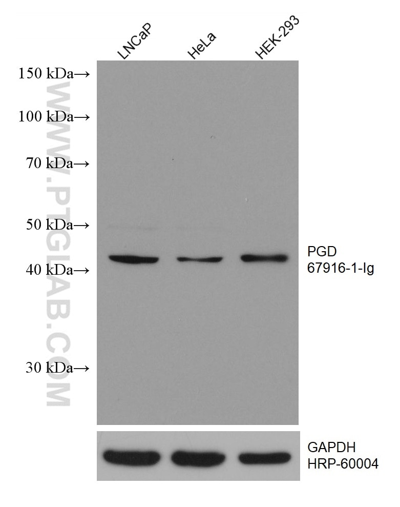 The PGD antibody from Proteintech is a mouse monoclonal antibody to a recombinant protein of human PGD. This antibody recognizes human antigen. The PGD antibody has been validated for the following applications: WB, IF/ICC, ELISA analysis.