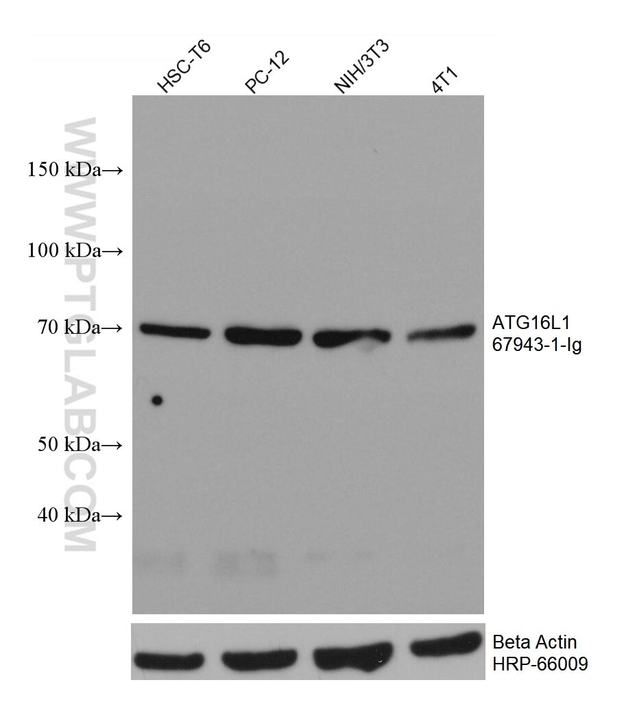 The ATG16L1 antibody from Proteintech is a mouse monoclonal antibody to a recombinant protein of human ATG16L1. This antibody recognizes human, mouse, rat antigen. The ATG16L1 antibody has been validated for the following applications: WB, IF/ICC, ELISA analysis.