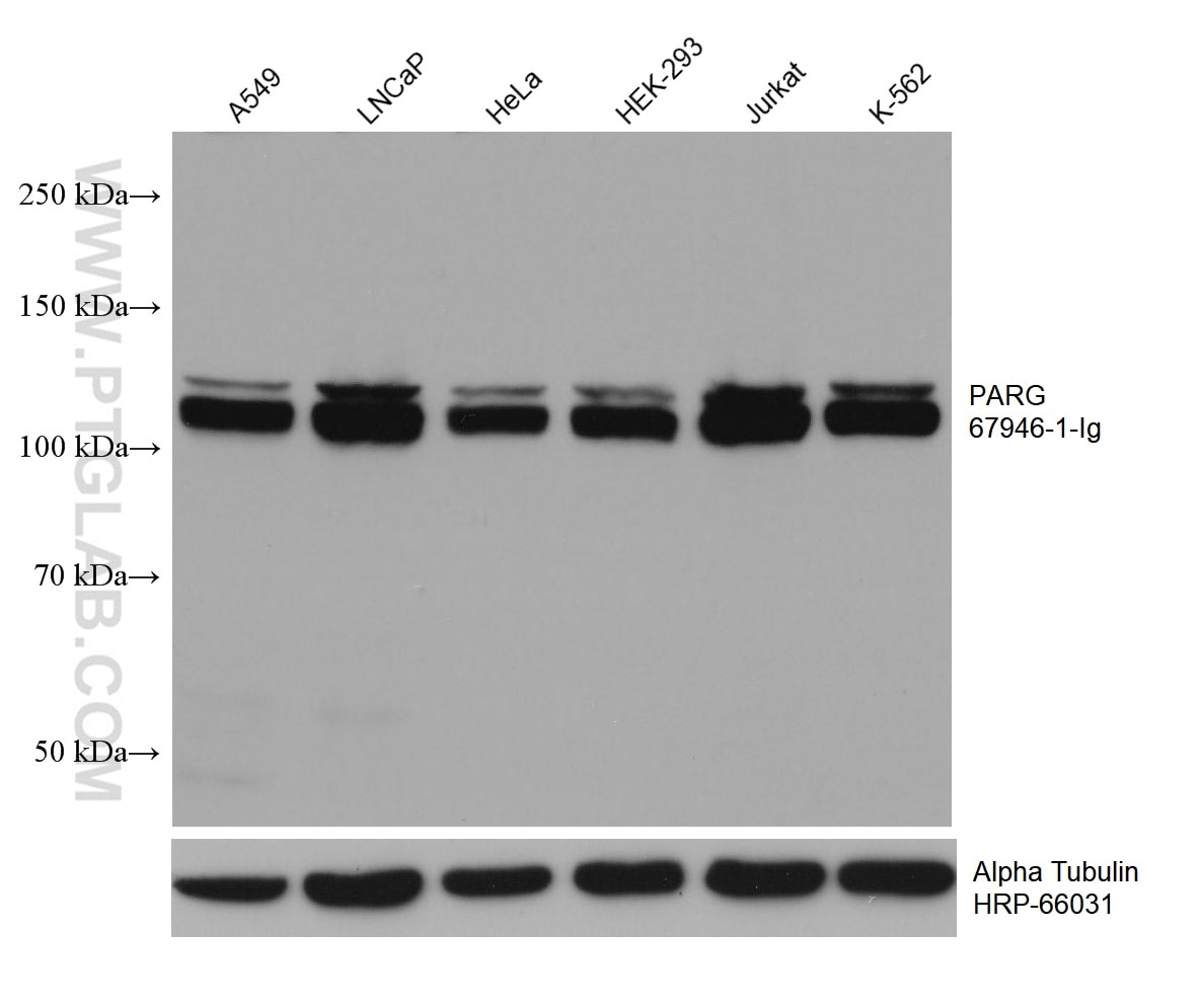 The PARG antibody from Proteintech is a mouse monoclonal antibody to a recombinant protein of human PARG. This antibody recognizes human antigen. The PARG antibody has been validated for the following applications: WB, IHC, IF/ICC, ELISA analysis.