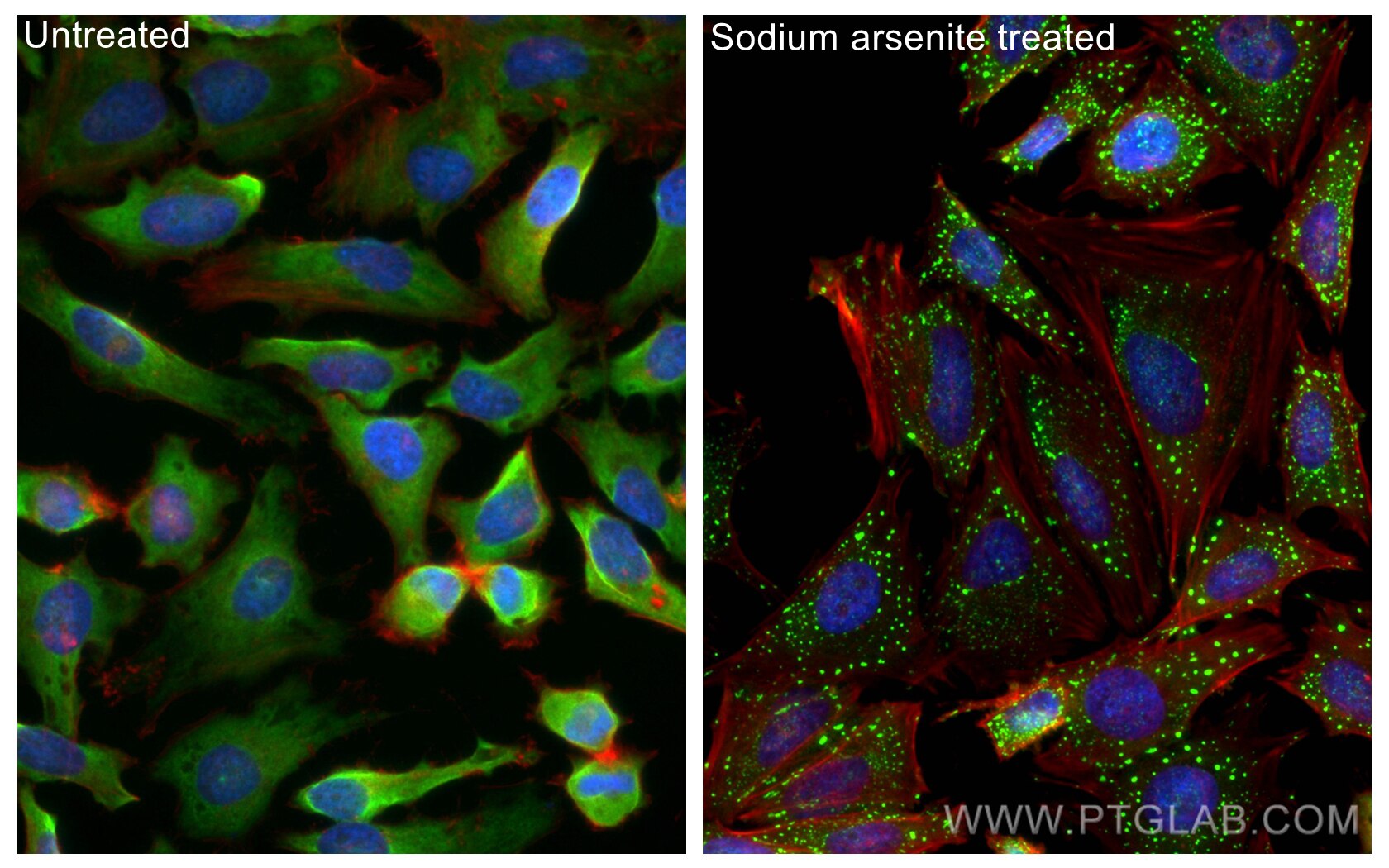 The G3BP1 antibody from Proteintech is a rabbit polyclonal antibody to a recombinant protein of human G3BP1. This antibody recognizes human, rat, mouse antigen. The G3BP1 antibody has been validated for the following applications: IF/ICC analysis. This antibody is coraliteR plus 488.