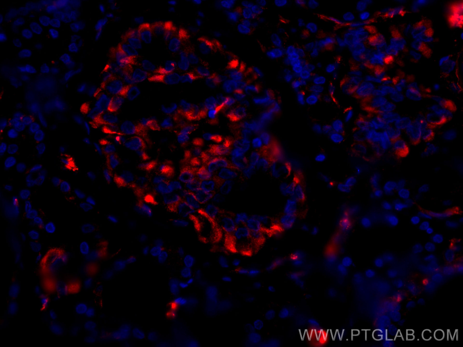 The GUK1 antibody from Proteintech is a mouse monoclonal antibody to a recombinant protein of human GUK1. This antibody recognizes human, mouse, rat antigen. The GUK1 antibody has been validated for the following applications: IF-P analysis. This antibody is coraliteR594.