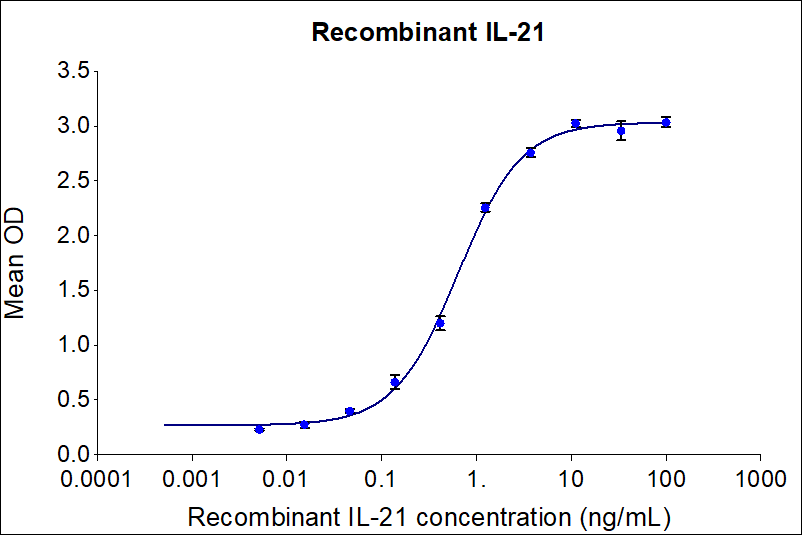 Recombinant human IL-21 (Cat no: HZ-1319) induces dose-dependent release of IFN-gamma in the NK-92 human cell line. NK-92 cells were treated with increasing concentration of recombinant IL-21 for 72 hours before supernatant collection. The supernatant was tested for IFN gamma using Proteintech’s AuthentiKine Human IFN-gamma ELISA Kit (KE00146). The EC50 was determined using a 4-parameter non-linear regression model. The EC50 range in 0.2-1 ng/mL.