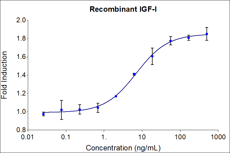 Recombinant human IGF-I (Cat no: HZ-1322) stimulates dose-dependent proliferation of the MCF-7 human breast cancer cell line. Cell number was quantitatively assessed by PrestoBlue Cell Viability Reagent. MCF-7 cells were treated with increasing concentrations of recombinant IGF-I for 96 hours. The EC50 was determined using a 4-parameter non-linear regression model. The EC50 range is 14-70 ng/mL.