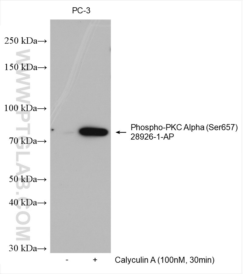 The Phospho-PKC Alpha (Ser657) antibody from Proteintech is a rabbit polyclonal antibody to a peptide of human Phospho-PKC Alpha (Ser657). This antibody recognizes human antigen. The Phospho-PKC Alpha (Ser657) antibody has been validated for the following applications: WB, IF/ICC, ELISA analysis.