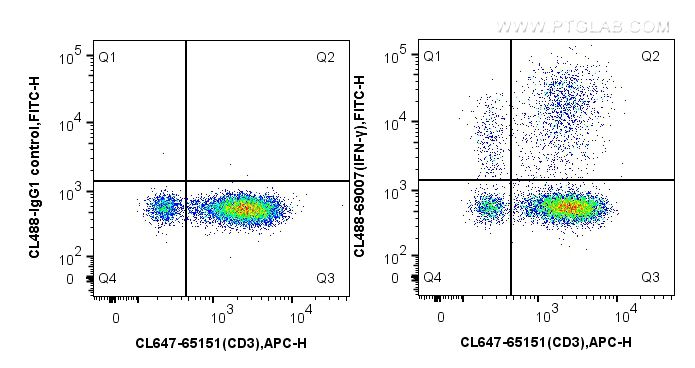 The IFN-gamma antibody from Proteintech is a mouse monoclonal antibody to a recombinantprotein of human IFN-gamma. This antibody recognizes human antigen. The IFN-gamma antibody has been validated for the following applications: FC (Intra) analysis. This antibody is coraliteR plus 488.