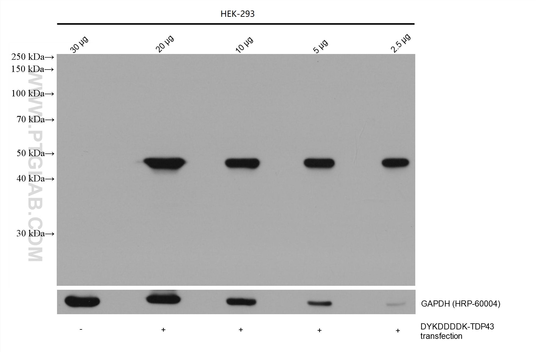 The DYKDDDDK tag antibody from Proteintech is a mouse monoclonal antibody to a peptide of DYKDDDDK tag. This antibody recognizes recombinant protein antigen. The DYKDDDDK tag antibody has been validated for the following applications: WB, IF/ICC, FC (Intra), IP, ELISA analysis.