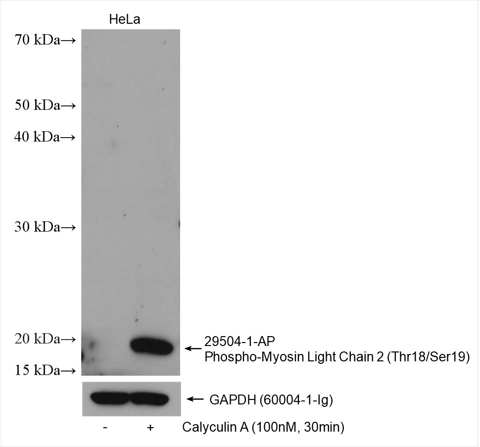 The Phospho-Myosin Light Chain 2 (Thr18/Ser19) antibody from Proteintech is a rabbit polyclonal antibody to a peptide of human Phospho-Myosin Light Chain 2 (Thr18/Ser19). This antibody recognizes human antigen. The Phospho-Myosin Light Chain 2 (Thr18/Ser19) antibody has been validated for the following applications: WB, FC (Intra), ELISA analysis.