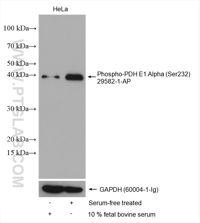 The Phospho-PDH E1 Alpha (Ser232) antibody from Proteintech is a rabbit polyclonal antibody to a peptide of human Phospho-PDH E1 Alpha (Ser232). This antibody recognizes human antigen. The Phospho-PDH E1 Alpha (Ser232) antibody has been validated for the following applications: WB, IF/ICC, ELISA analysis.