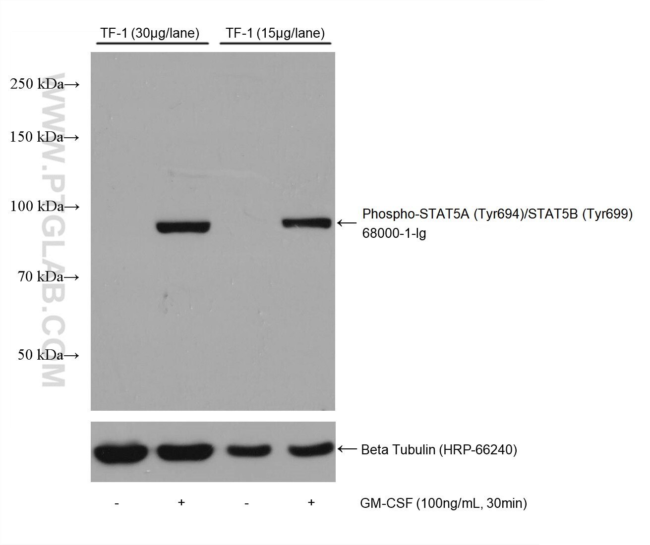 The Phospho-STAT5A (Tyr694)/STAT5B (Tyr699) antibody from Proteintech is a mouse monoclonal antibody to a peptide of human Phospho-STAT5A (Tyr694)/STAT5B (Tyr699). This antibody recognizes human antigen. The Phospho-STAT5A (Tyr694)/STAT5B (Tyr699) antibody has been validated for the following applications: WB, FC (Intra), ELISA analysis.
