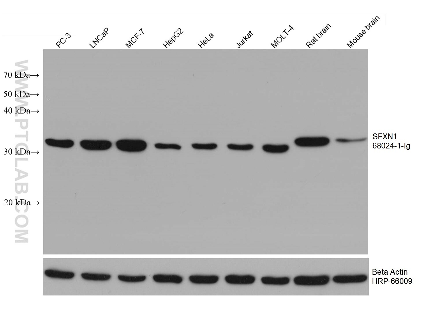 The SFXN1 antibody from Proteintech is a mouse monoclonal antibody to a recombinant protein of human SFXN1. This antibody recognizes human, rat, mouse antigen. The SFXN1 antibody has been validated for the following applications: WB, IF/ICC, ELISA analysis.