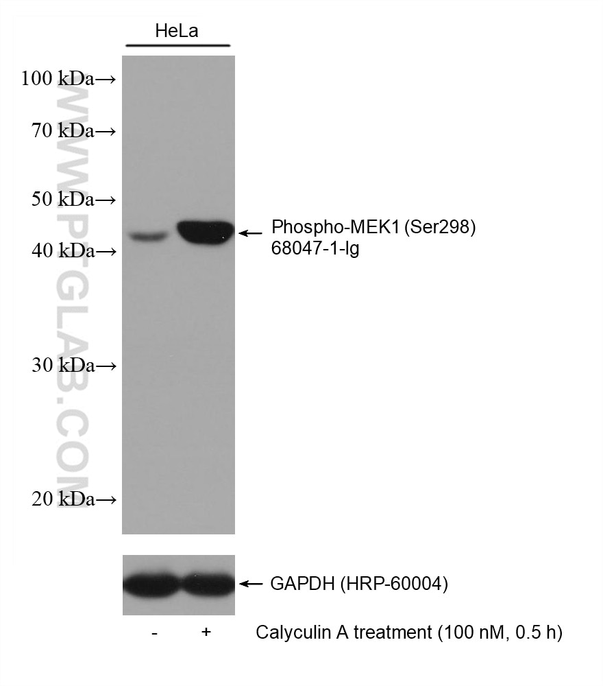 The Phospho-MEK1 (Ser298) antibody from Proteintech is a mouse monoclonal antibody to a peptide of human Phospho-MEK1 (Ser298). This antibody recognizes human antigen. The Phospho-MEK1 (Ser298) antibody has been validated for the following applications: WB, ELISA analysis.