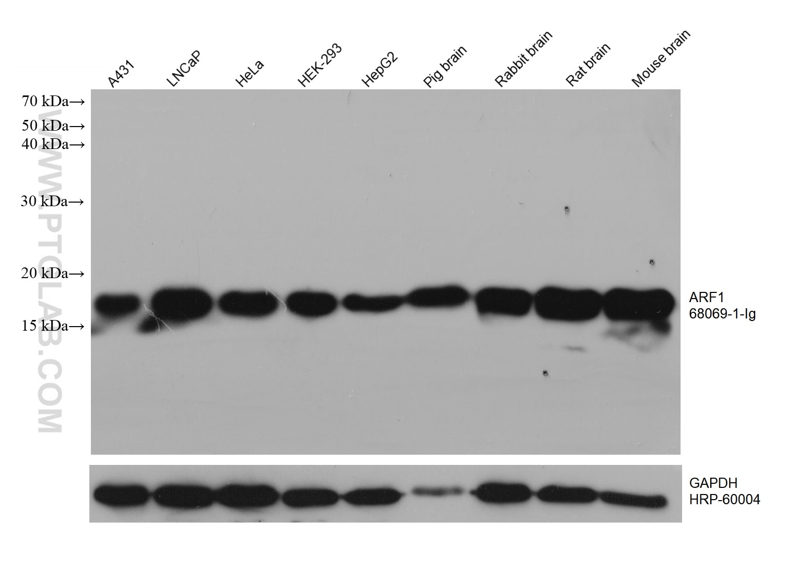 The ARF1 antibody from Proteintech is a mouse monoclonal antibody to a recombinant protein of human ARF1. This antibody recognizes human, mouse, rat, pig, rabbit antigen. The ARF1 antibody has been validated for the following applications: WB, IF/ICC, ELISA analysis.