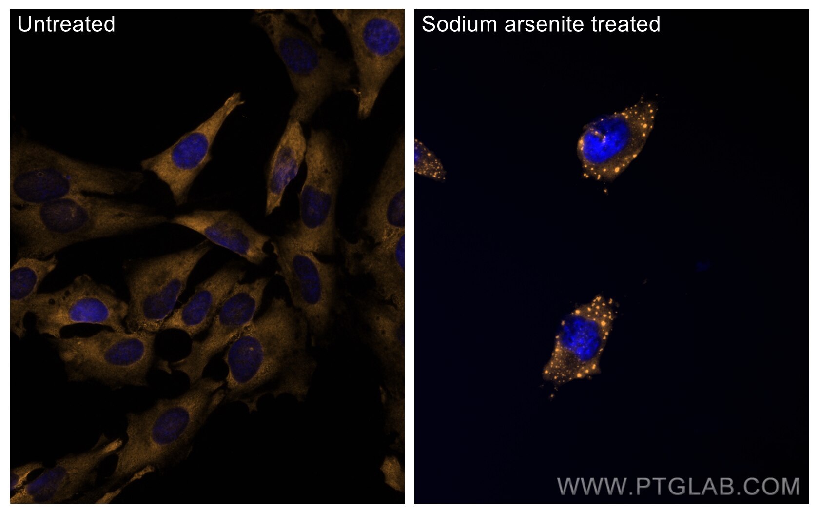 The G3BP1 antibody from Proteintech is a rabbit polyclonal antibody to a recombinant protein of human G3BP1. This antibody recognizes human, rat, mouse antigen. The G3BP1 antibody has been validated for the following applications: IF/ICC, FC (Intra) analysis. This antibody is coraliteR555.