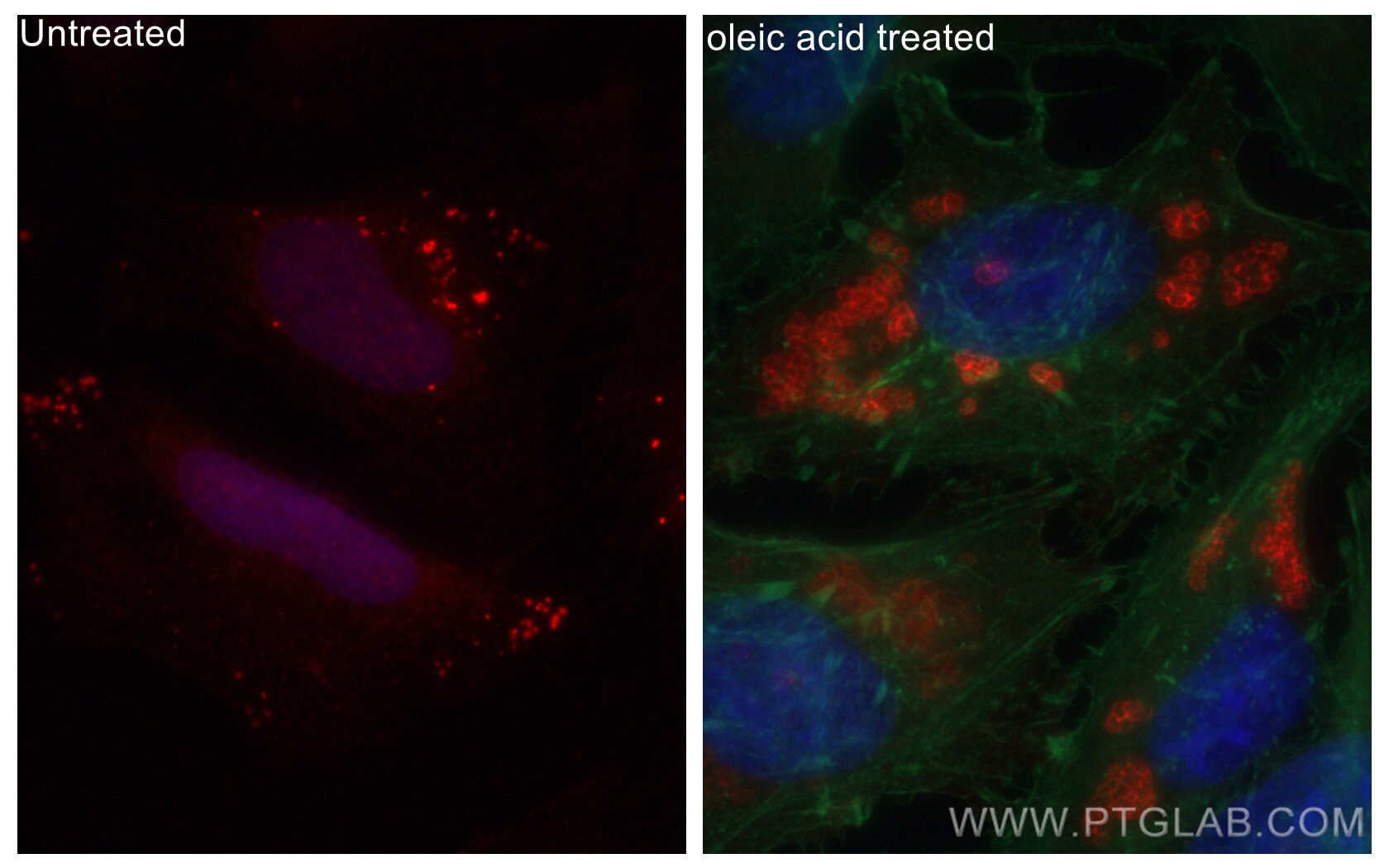 The Perilipin-2 antibody from Proteintech is a rabbit polyclonal antibody to a recombinant protein of human Perilipin-2. This antibody recognizes human, mouse, rat antigen. The Perilipin-2 antibody has been validated for the following applications: IF/ICC analysis. This antibody is coraliteR594.