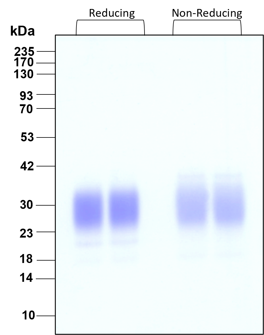 Purity of recombinant human IL-22 was determined by SDS- polyacrylamide gel electrophoresis. The protein was resolved in an SDS- polyacrylamide gel in reducing and non-reducing conditions and stained using Coomassie blue.