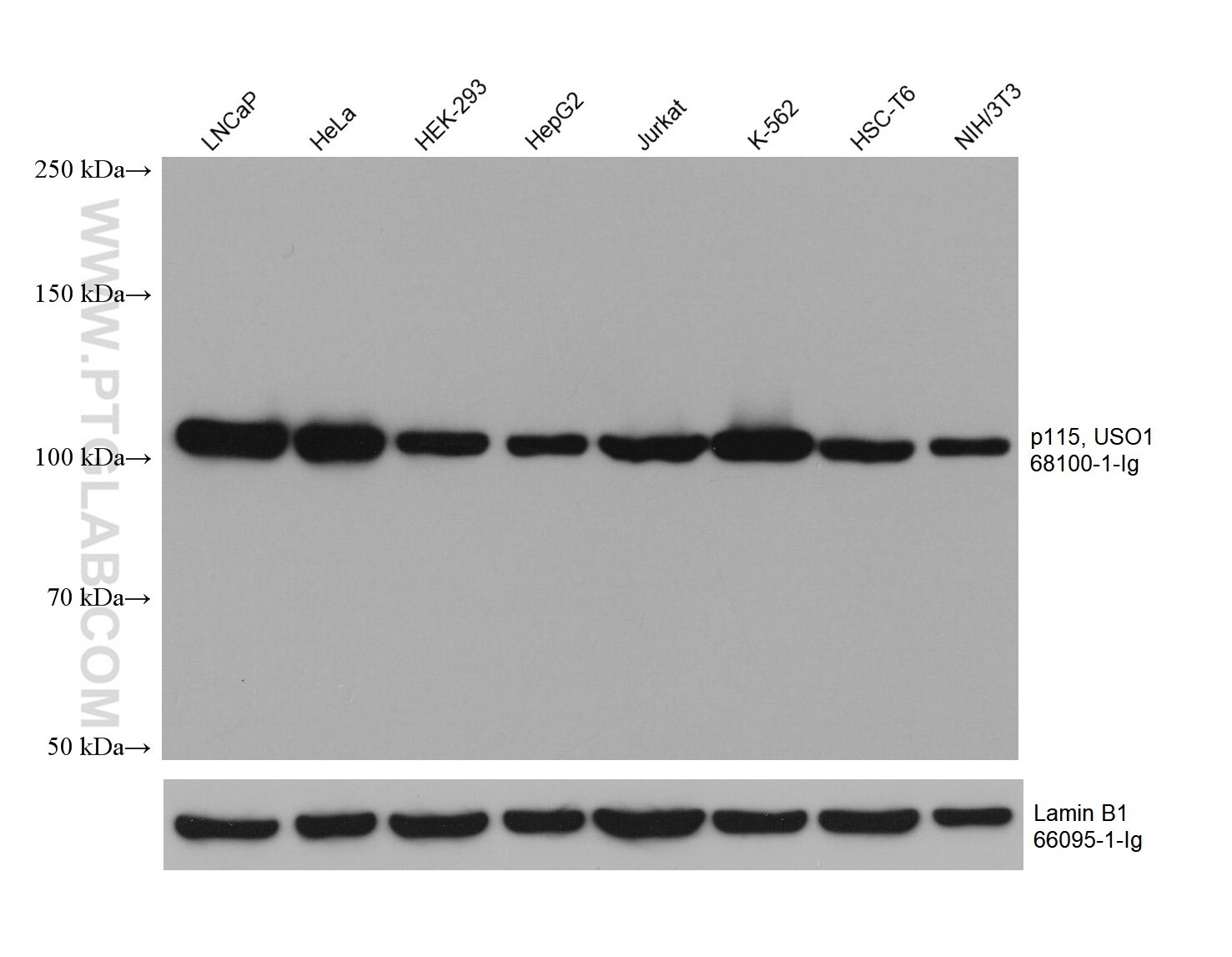 The p115, USO1 antibody from Proteintech is a mouse monoclonal antibody to a recombinant protein of human p115, USO1. This antibody recognizes human, mouse, rat antigen. The p115, USO1 antibody has been validated for the following applications: WB, IHC, IF/ICC, ELISA analysis.