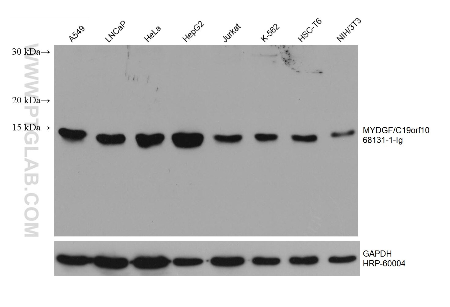 The MYDGF/C19orf10 antibody from Proteintech is a mouse monoclonal antibody to a recombinant protein of human MYDGF/C19orf10. This antibody recognizes human, mouse, rat antigen. The MYDGF/C19orf10 antibody has been validated for the following applications: WB, IHC, IF/ICC, FC (Intra), ELISA analysis.