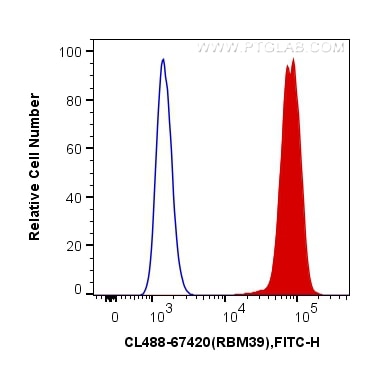 The RBM39 antibody from Proteintech is a mouse monoclonal antibody to a recombinant protein of human RBM39. This antibody recognizes human, mouse, rat antigen. The RBM39 antibody has been validated for the following applications: IF/ICC, FC (Intra) analysis. This antibody is coraliteR plus 488.