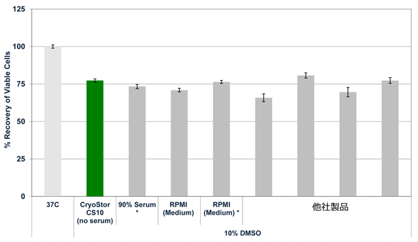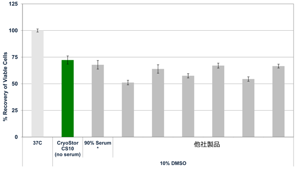 無血清 CryoStorR 3種類(2%、5%、10% DMSO)をそれぞれ使用した時の凍結保存後のヒト間葉系幹細胞の細胞生存率。