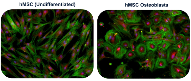 冷凍保存後のヒト間葉系幹細胞の分化能および形態観察画像。